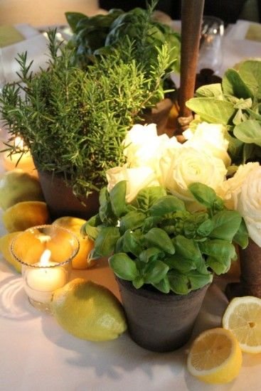 Az asztaldekorációban kerülhetnek illatos fűszernövények, (pl bazsalikom) vagy gyümölcsök is. A bazsalikom, vagy a rozmaring illata már önmagában is ínycsiklandó, és aki szeretné az ételét is fűszerezheti vele. Ha kisebb cserépben rakjátok ki őket, akkor akár köszönő ajándék is lehet belőle. A cserepes növénydekoráció környezettudatos választás, erről több ötletet is kaphatsz itt: 10 tipp a környezettudatos esküvőhöz